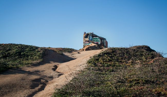 A fence and signs tell people to stay away from the graffiti covered bunker that now teeters on narrow base of crumbly dirt. It makes for great photographs from places including Gray Whale Cove and the Devils Slide Trail.