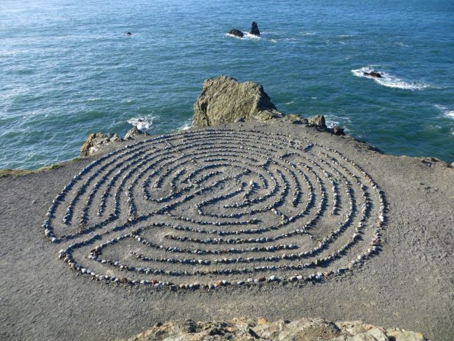 On your next trip to San Francisco take the hike out to Mile Rock Beach at Lands End. Just above the beach there are two military gun foundations embedded in a flat shelf in the rock. Between these foundations you’ll find the Lands End Labyrinth (also known as the Eagle Point Labyrinth).