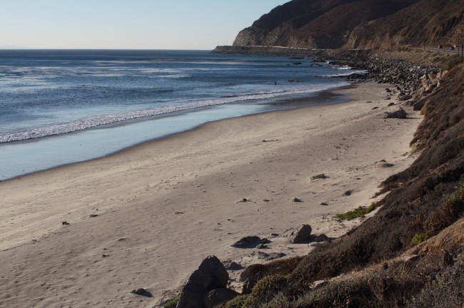 Bass Rock Beach is at a signed but unnamed coastal access along Pacific Coast Highway not far from the Ventura and Los Angeles County border. The state has provided a concrete stairway that leads from a strip of shoulder parking on PCH to the sandy beach below. Erosion has undercut the base of the stairs so you have to jump or climb down on the rocks at the bottom. Waves crash on large rocks at both ends of the beach. The rock just offshore at the south end is officially named Bass Rock and the area around it is a known surf casting fishing spot. At low tides there are tide pools exposed here. Since this beach is right off the busy highway, it’s not much of a destination, but it makes a nice stopping point along this scenic drive.